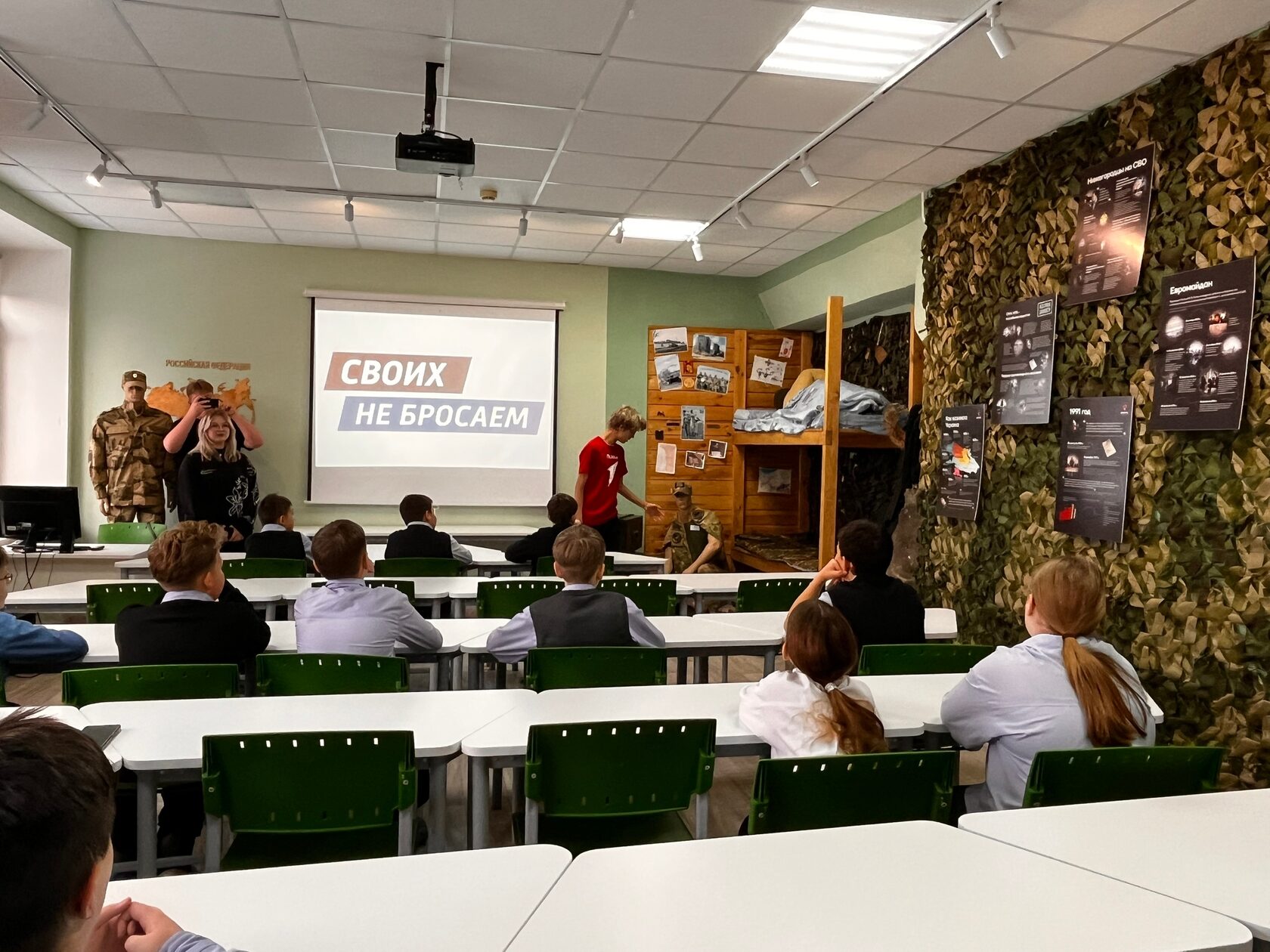 В рамках визита ребята ознакомились с музеем «СВОИх не бросаем», посвящённым важным событиям и людям, связанным со специальной военной операцией. Экскурсию провели наши сотрудники: советник директора и руководитель музея Наталья Александровна Антропова, а также студенты-экскурсоводы Виктория Милова, Егор Нестеров и Антон Шаталов.